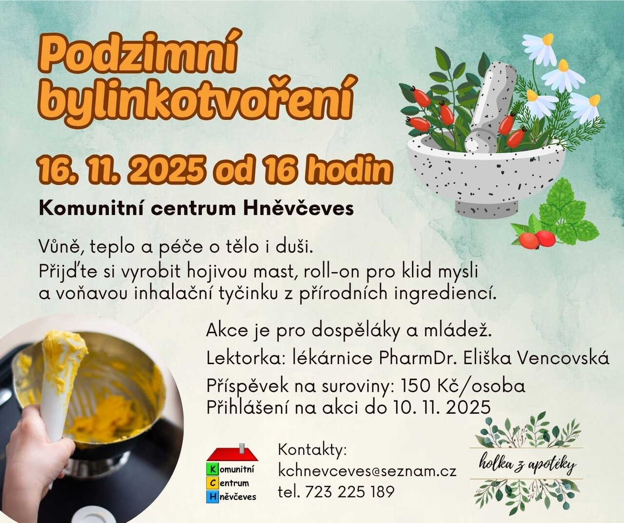 Příspěvek na suroviny a materiál: 150 Kč/osoba.